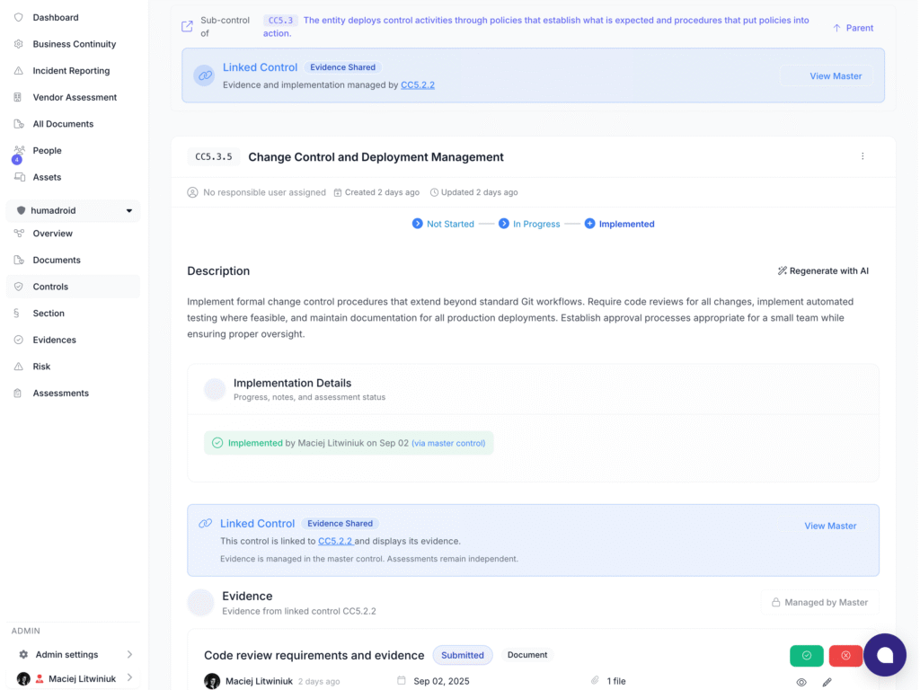 - Automatic Sharing: The new sub-control automatically displays all the evidence, documents, and implementation details from the original